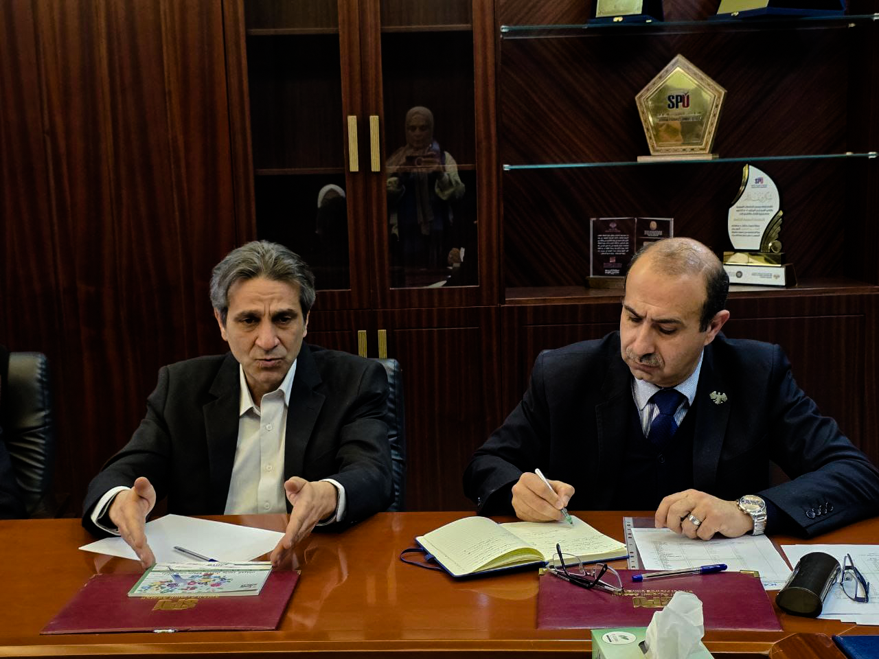 <span lang="AR-SA" style="font-family:"Arial",sans-serif;mso-ascii-font-family:Calibri;mso-ascii-theme-font:minor-latin;mso-hansi-font-family:Calibri;mso-hansi-theme-font:minor-latin">حضر اللقاء عميد كلية الطب الدكتور أيمن عليونائبه الدكتور لؤي نحاس، وعميد كليةالصيدلة الدكتور حسام الدين شحرر، وعيد كلية طب الأسنان الدكتور طلعت أبو الحطب،عميد كلية هندسة الذكاء الصنعي الدكتور مهيب النقري ومدير الجودة والاعتمادالأكاديمي الاستاذ همام حمصي.