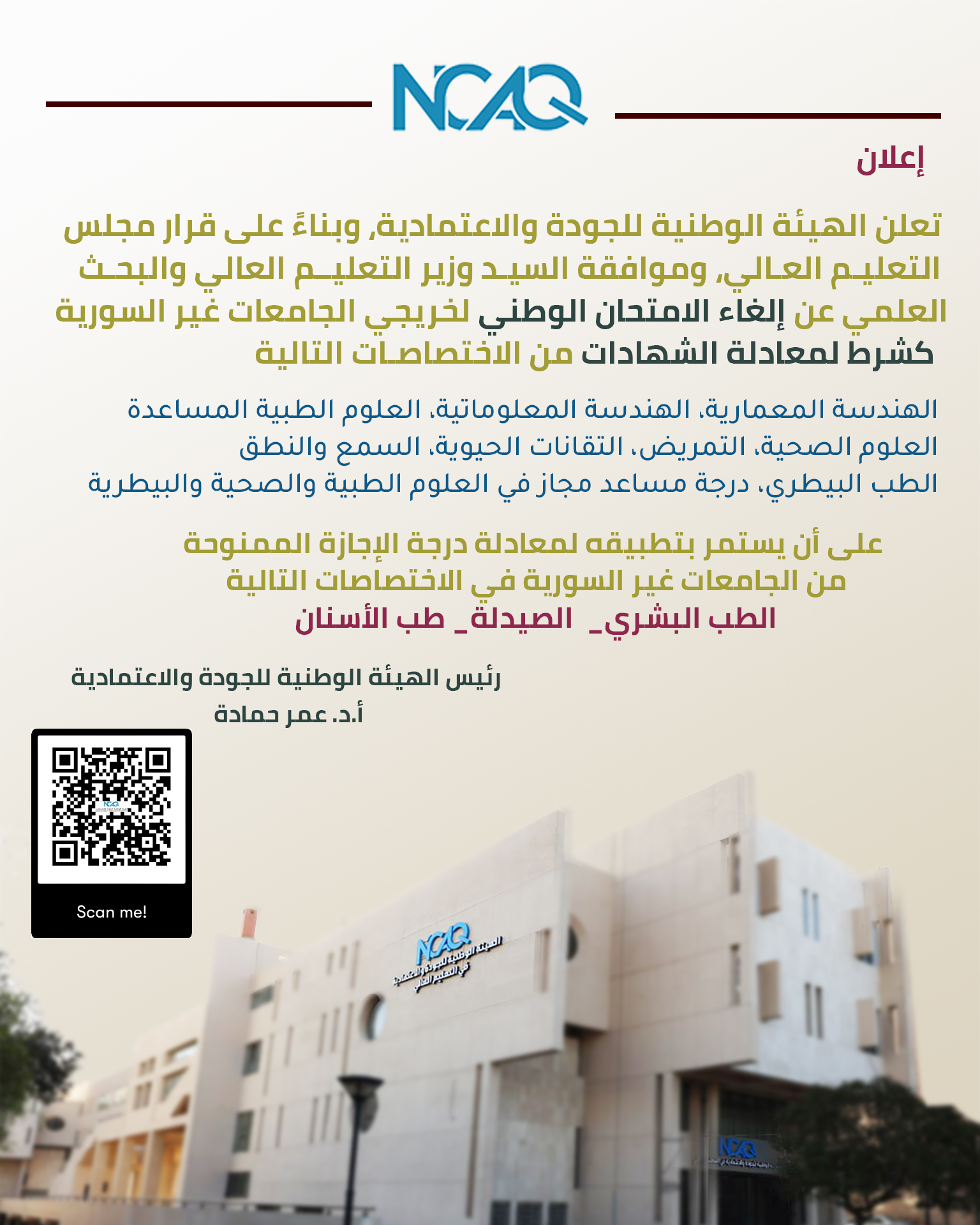 تعلن الهيئة الوطنية للجودة والاعتمادية، وبناءً على قرار مجلس التعليم العالي وموافقة السيد وزير التعليم العالي والبحث العلمي، عن إلغاء الامتحان الوطني لخريجي الاختصاصات التالية من الجامعات غير السورية