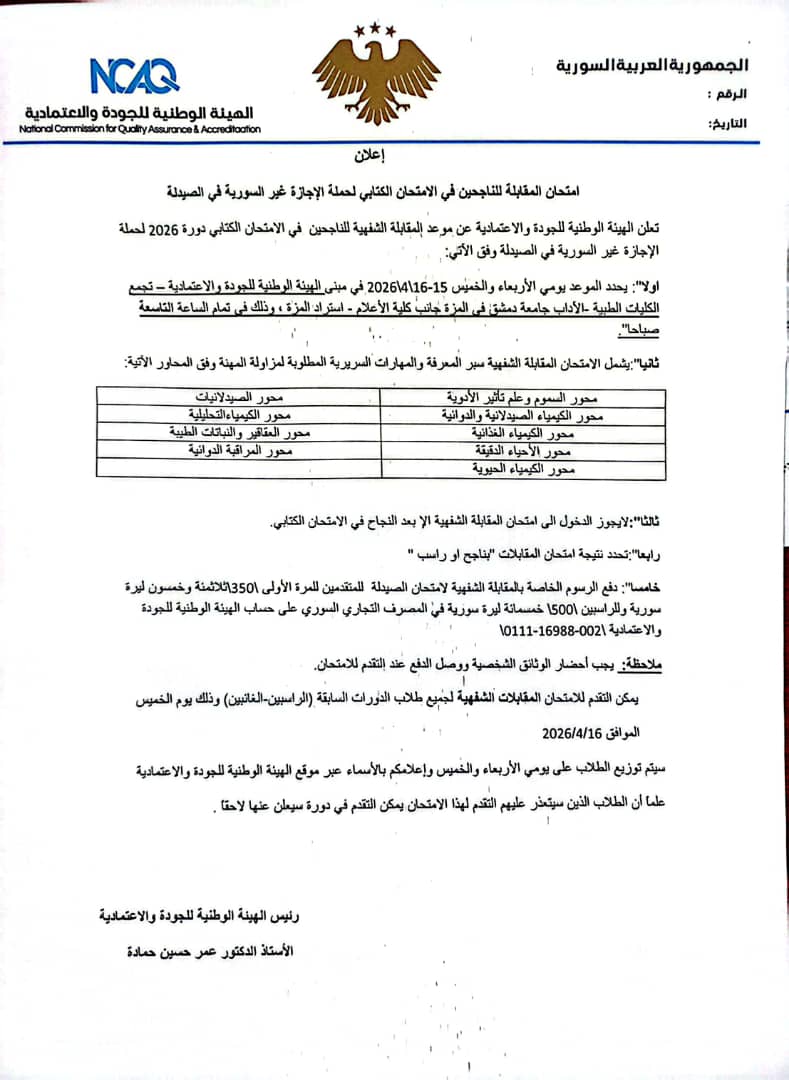 اعلان امتحان الصيدلة الموحد -الدورة الأولى 2026 (الجامعات غير السورية)