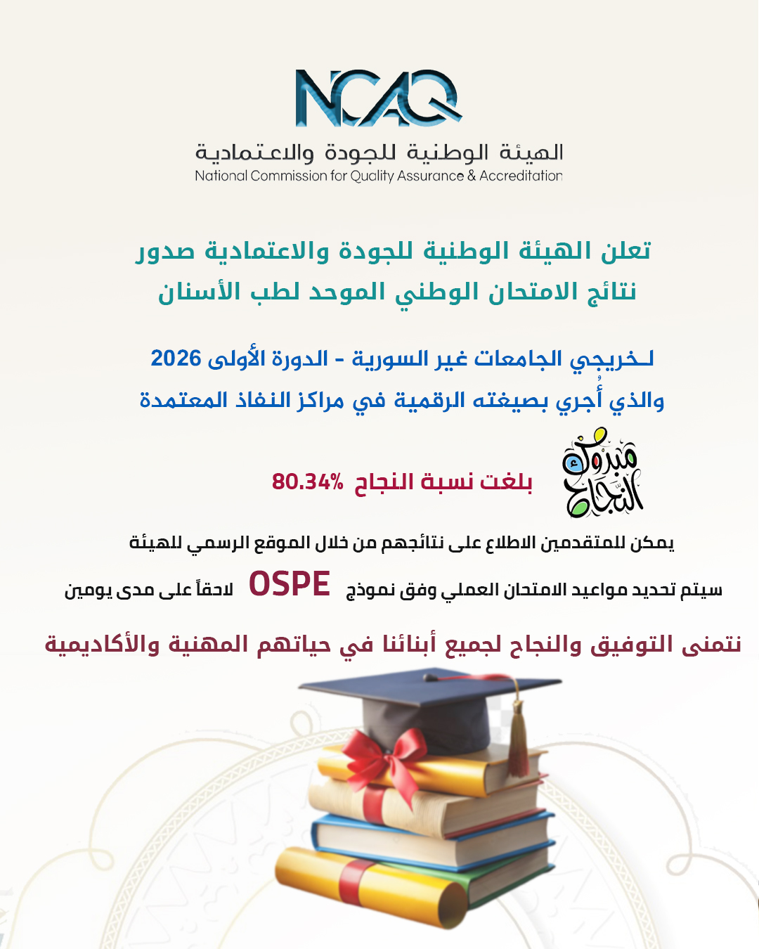 تعلن الهيئة الوطنية للجودة والاعتمادية صدور نتائج الامتحان الوطني الموحد لطب الأسنان خريجي الجامعات غير السورية – الدورة الأولى 2026، والذي أُجري بصيغته الرقمية في مراكز النفاذ المعتمدة.