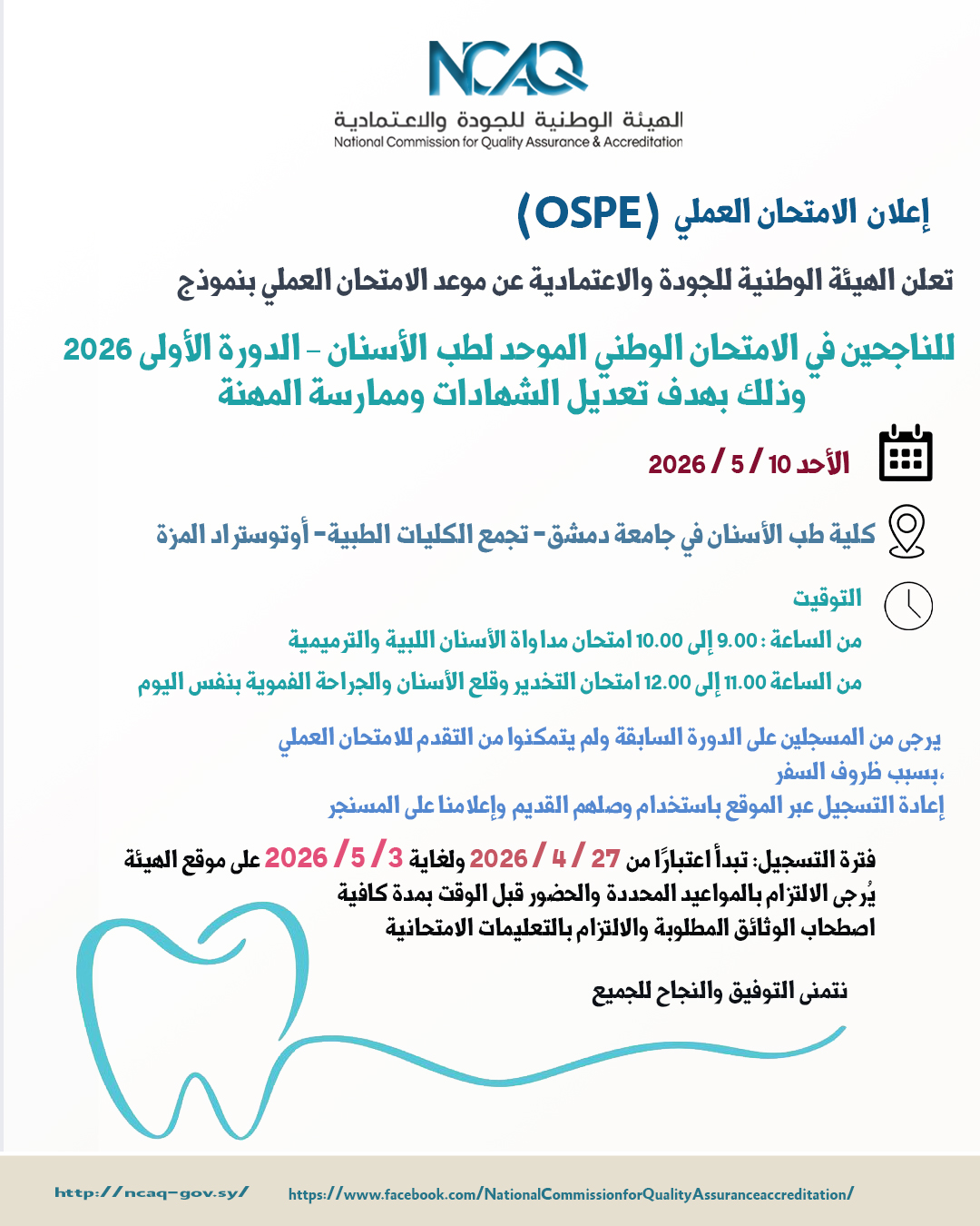 للناجحين في الامتحان الوطني الموحد لطب الأسنان – الدورة الأولى 2026، وذلك يوم 10 أيار 2026، في إطار استكمال متطلبات تعديل الشهادات والسماح بممارسة المهنة وفق الأصول المعتمدة.