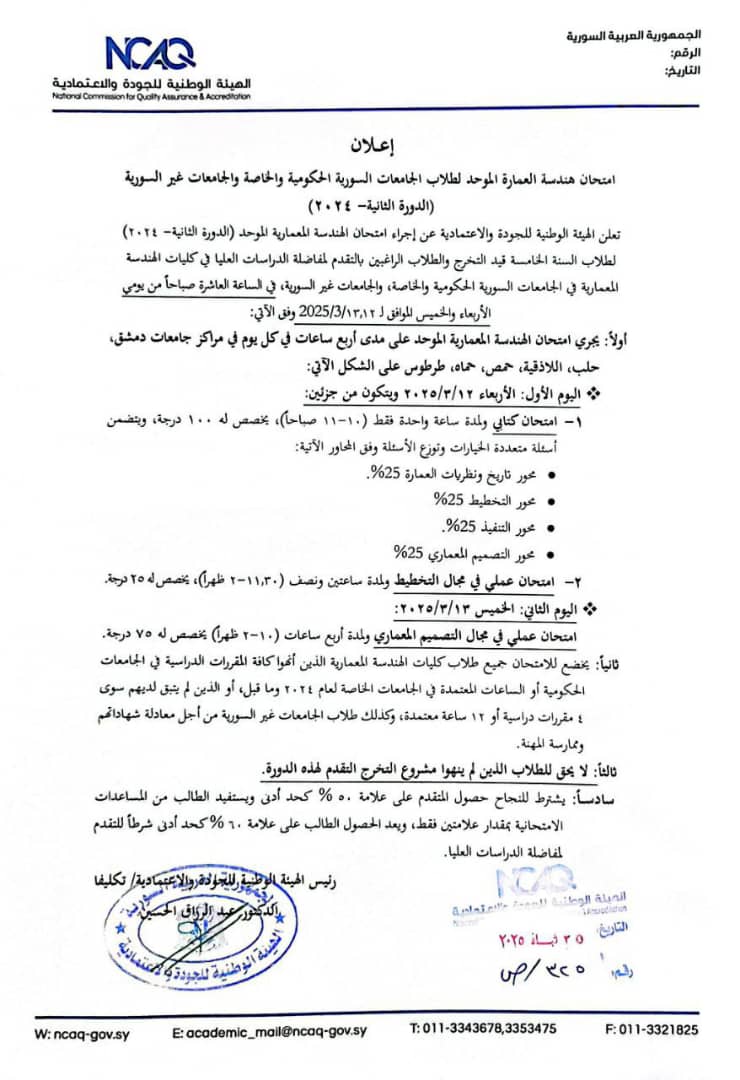 اعلان امتحان العمارة الدورة الثانية ٢٠٢٤
