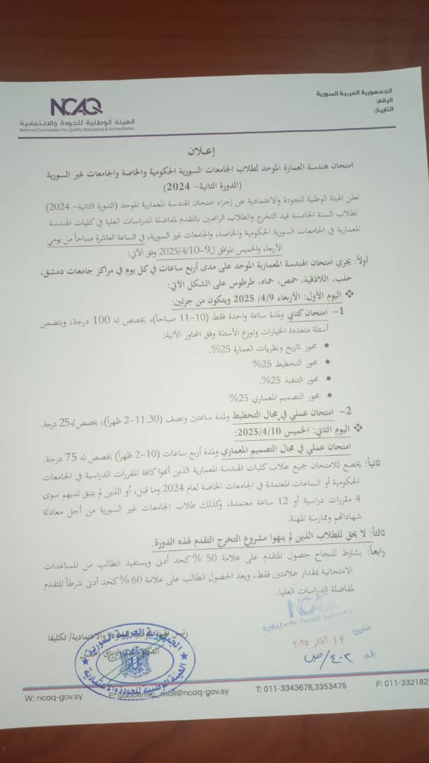 تحديد موعد امتحان العمارة الدورة الثانية ٢٠٢٤