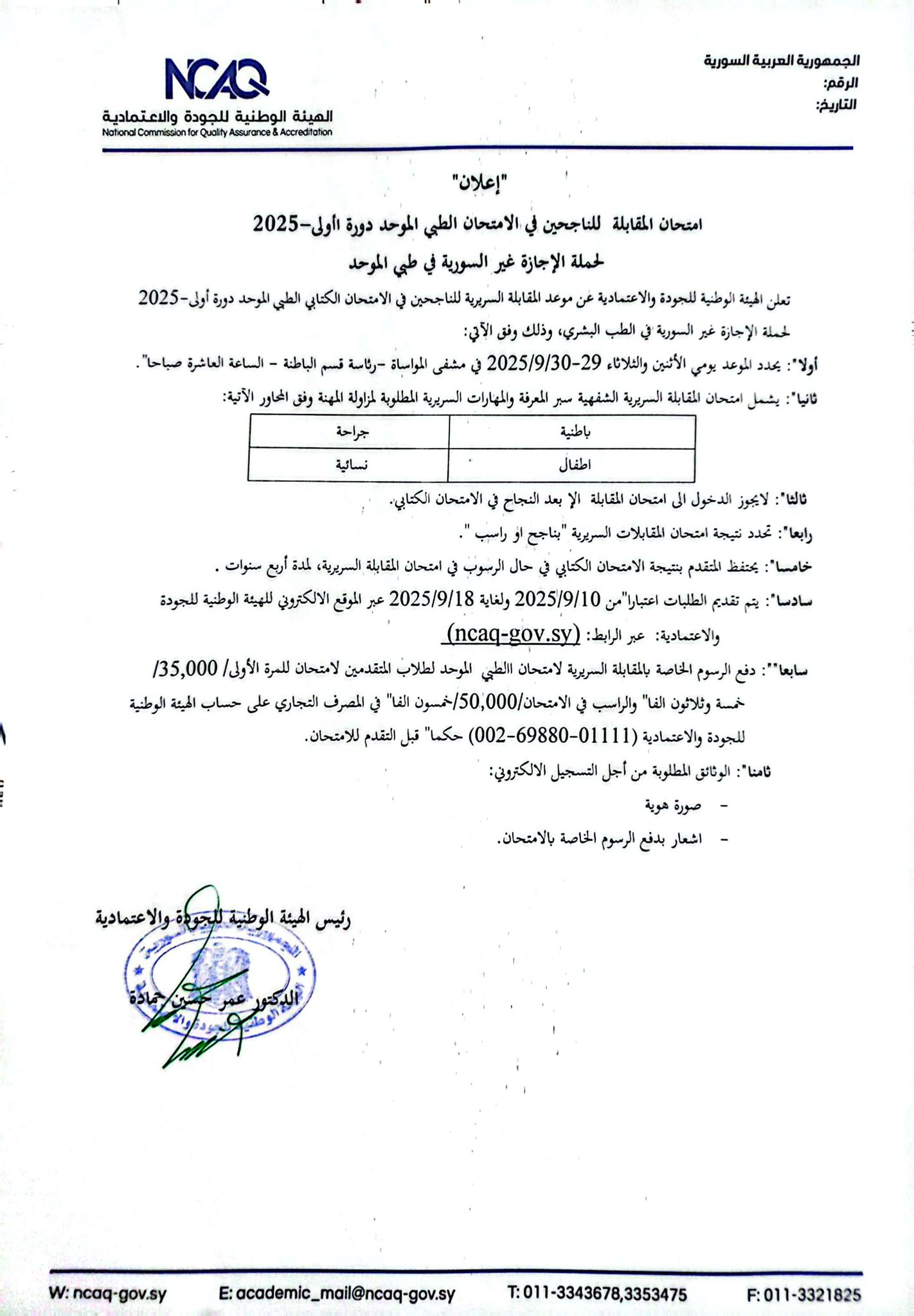 اعلان امتحان المقابلة للناجحين في الامتحان الكتابي الطب البشري دورة اولى2025