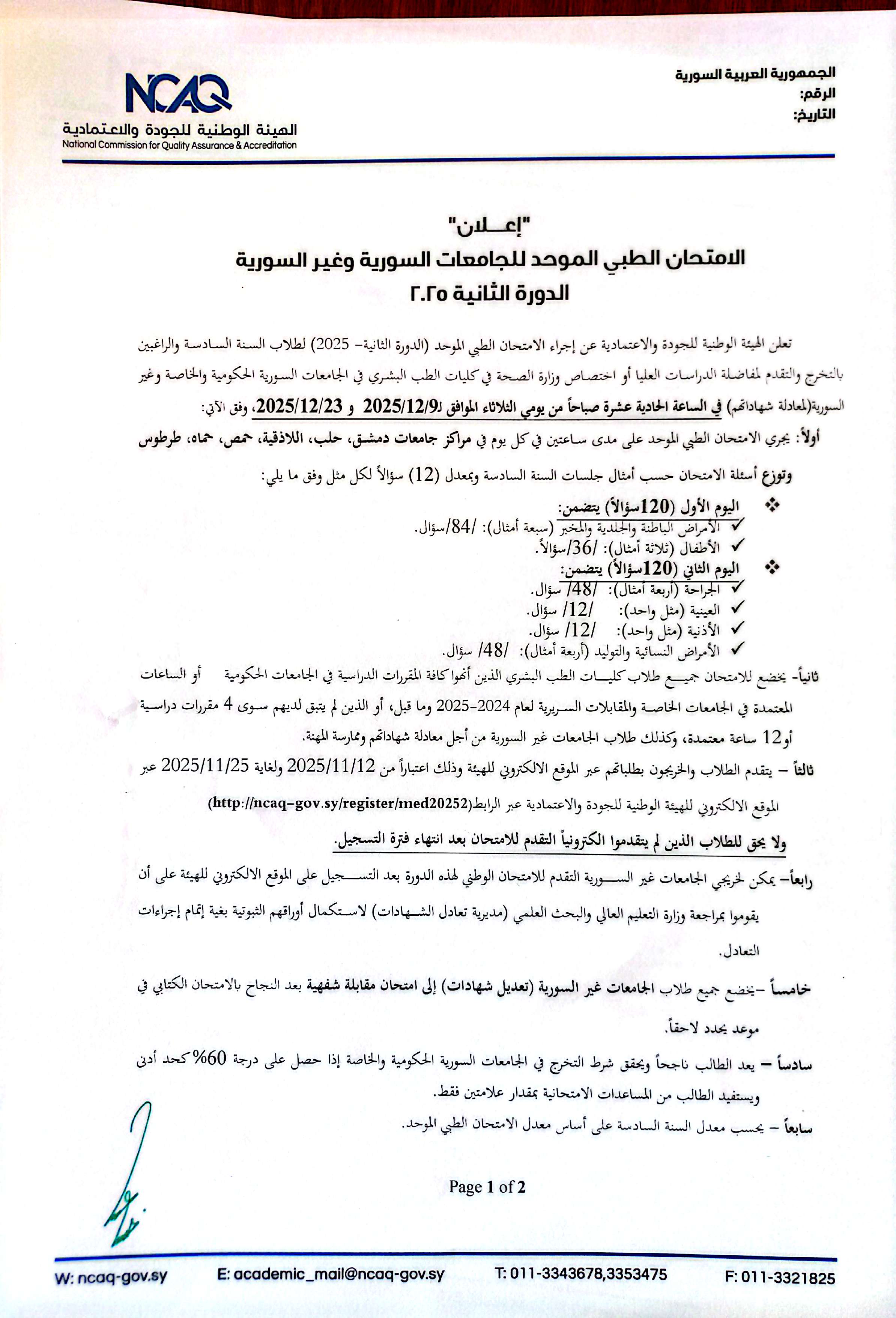 اعلان الامتحان الطبي الموحد-الدورة الثانية 2025